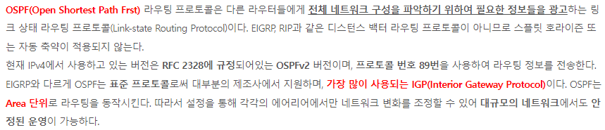 OSPF (Open Shortest Path First)OSPF(Open Shortest Path Frst) 라우팅 프로토콜은 다른 라우터들에게 전체 네트워크 구성을 파악하기 위하여 필요한 정보들을 광고하는 링크 상태 라우팅 프로토콜(Link-state Routin