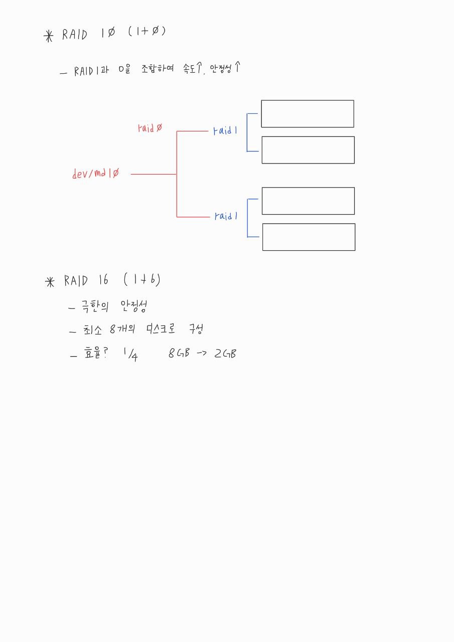 - RAID 0에서 성능, 용량을 조금 줄이는 대신 안정성을 높인 것