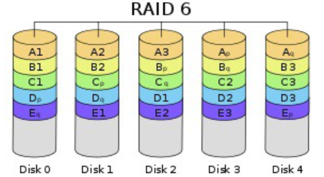 - Block 단위로 striping을 하고, error correction을 위해 패리티를 2개의 디스크에 저장(RAID5와의 차이점)