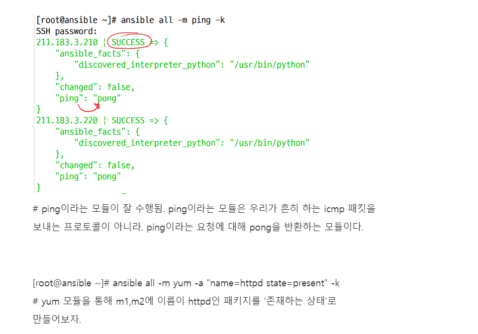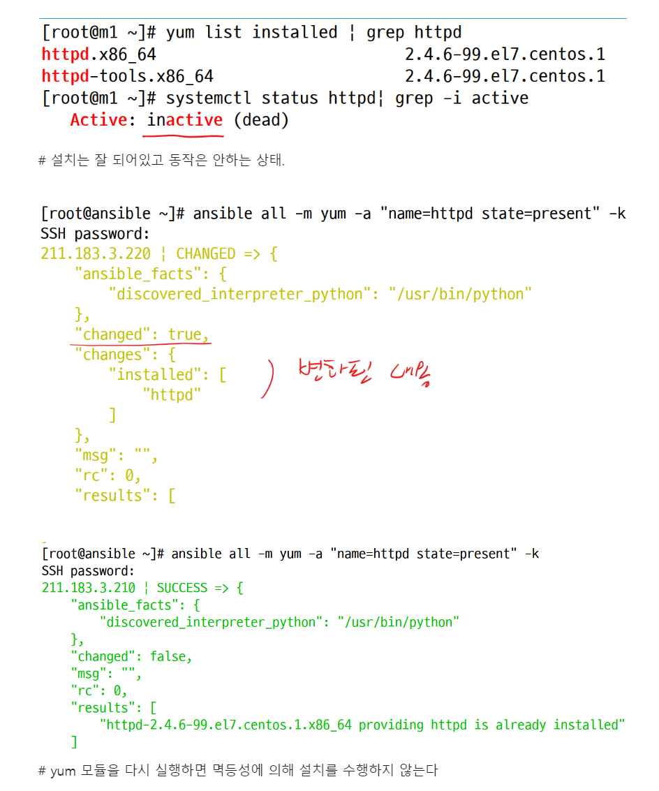 [root@ansible ~]# ansible all -m yum -a "name=httpd state=present" -k