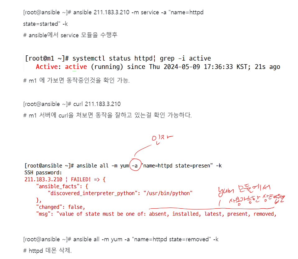[root@ansible ~]# ansible 211.183.3.210 -m service -a "name=firewalld state=started" -k