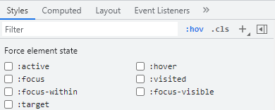 개발자 도구에서 확인할 수 있는 가장 중요한 selector는 state이다. 웹페이지에서 F12를 누르고 개발자 도구를 들어가서 확인해보자. 우측하단의 :hov를 눌러 확인해보면 다음과 같은 창이 뜬다.