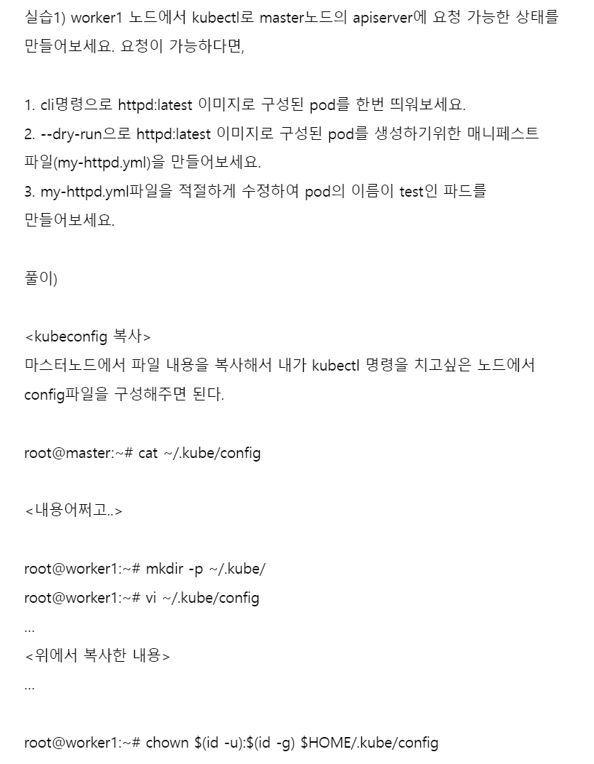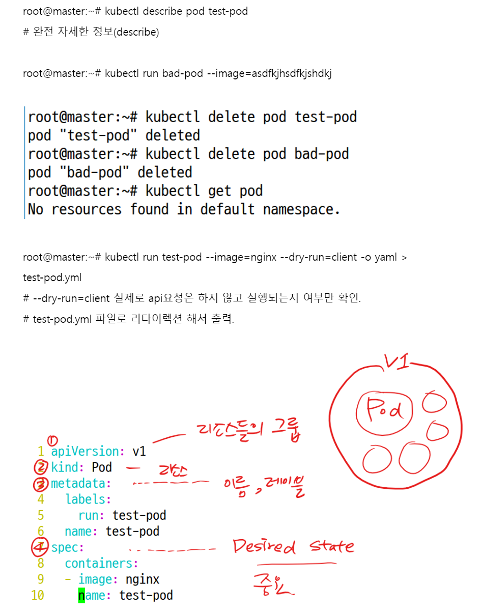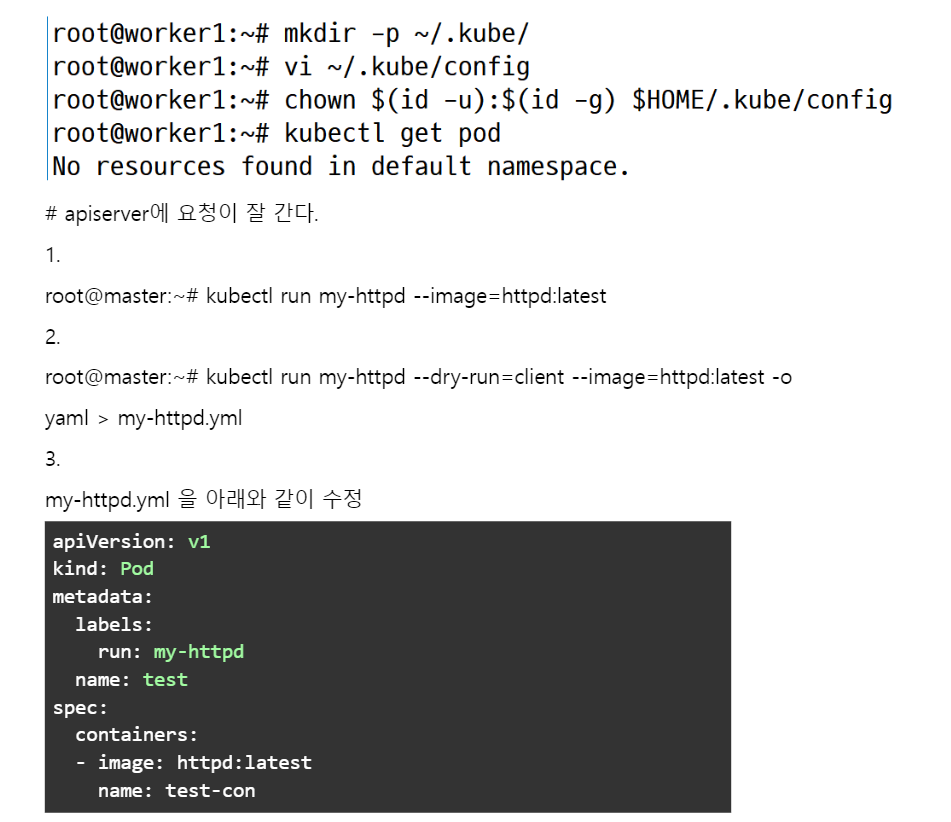 kubectl run <pod이름> --image=<이미지이름:버젼> --dry-run=client -o yaml - 여기서 --dry-run-client의 의미는 실제로 api요청은 하지 않고 실행되는지 여부만 확인하겠다는 의미이다.