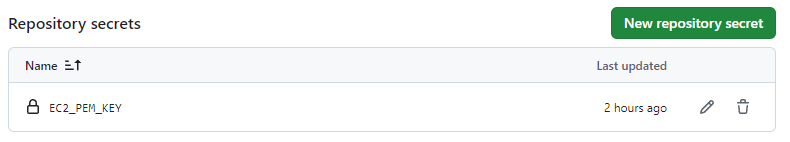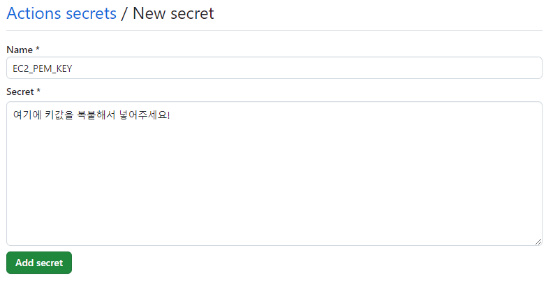 변수명과 내용을 적어주자. 필자의 경우 EC2에 AWS에서 발급받은 pem키값으로 SSH접속을 할 것이기 때문에 Pem 키값을 넣어줬다.