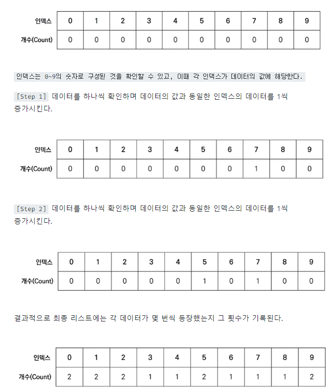 count[array[i]] += 1 # 각 데이터에 해당하는 인덱스의 값 증가